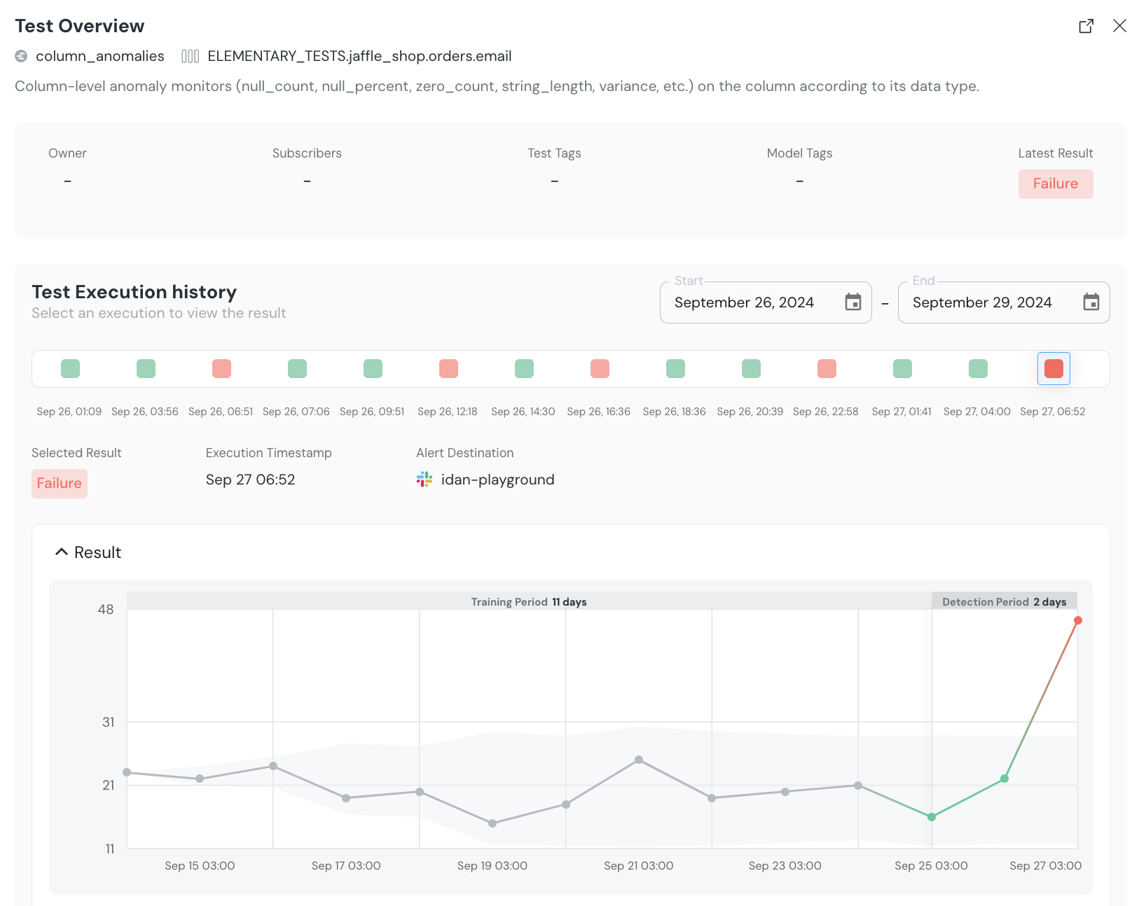 The new view includes the complete test configuration and execution history, and for each result, it includes the result description, test query, and a row sample/anomaly chart (depending on the test type)