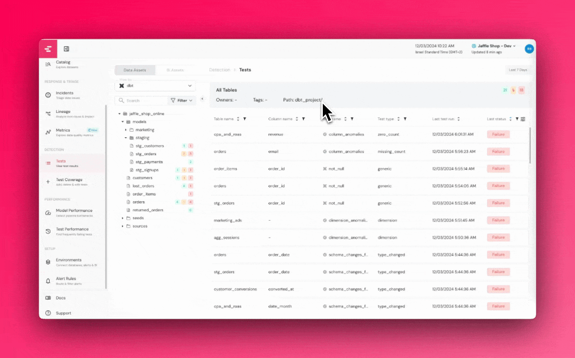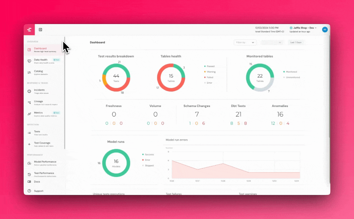 The results of your jobs are critical to the data health. These are now included in the Elementary dashboard, for you to get a complete overview of the status of your pipelines. We added a breakdown of the latest result of each model, and the aggregated failures over time.