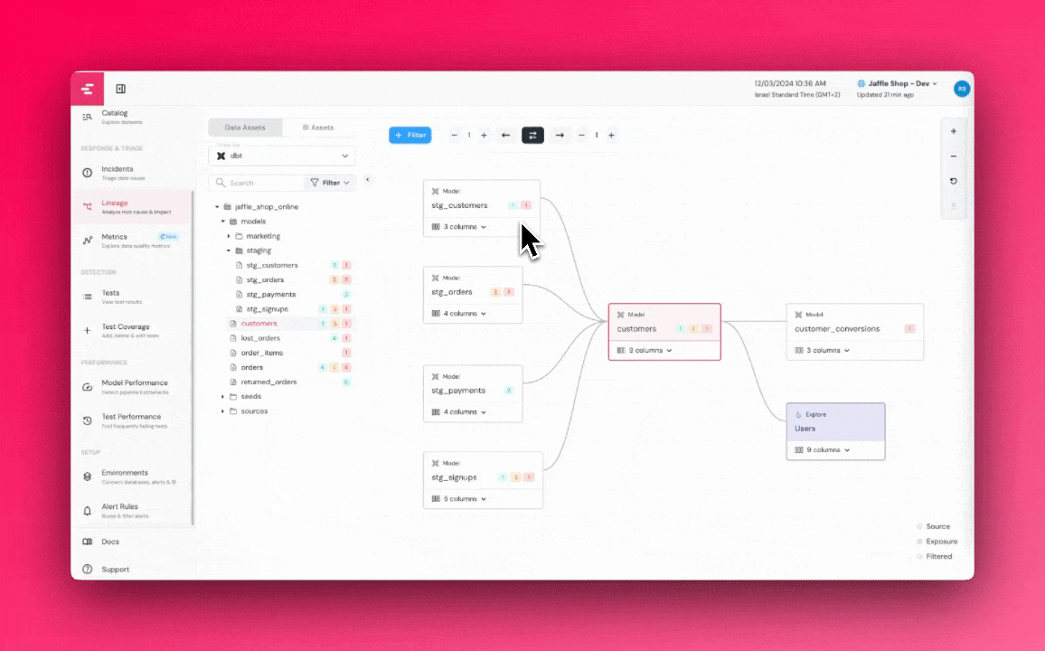 With this new release you can filter the lineage graph on a specific column that has an issue, and see if upstream or downstream columns