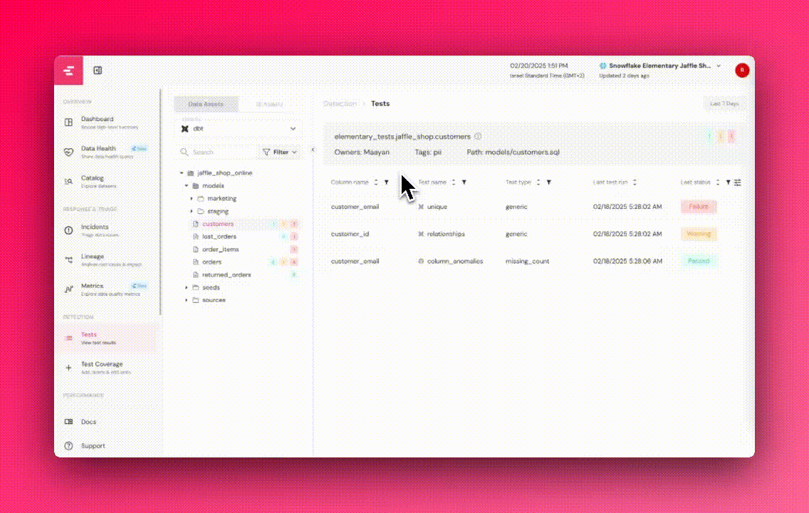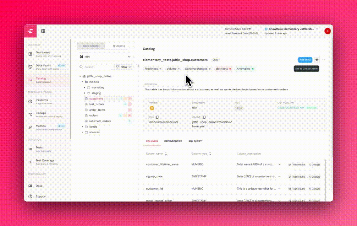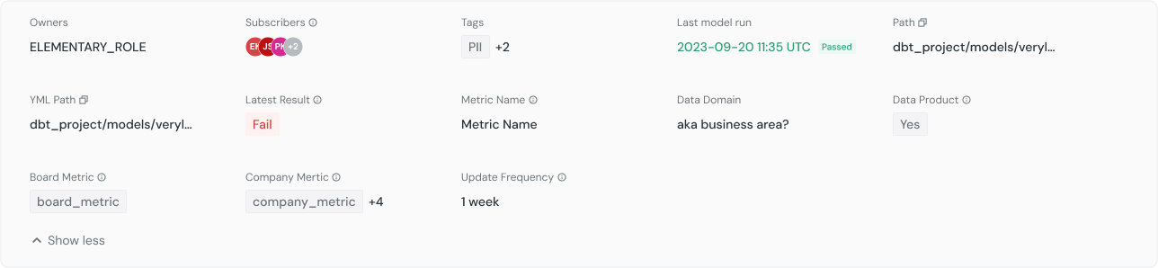Custom attributes from ****dbt’s meta field are now visible in the Elementary catalog, enhancing context and improving collaboration by bringing key metadata directly into your observability workflows.