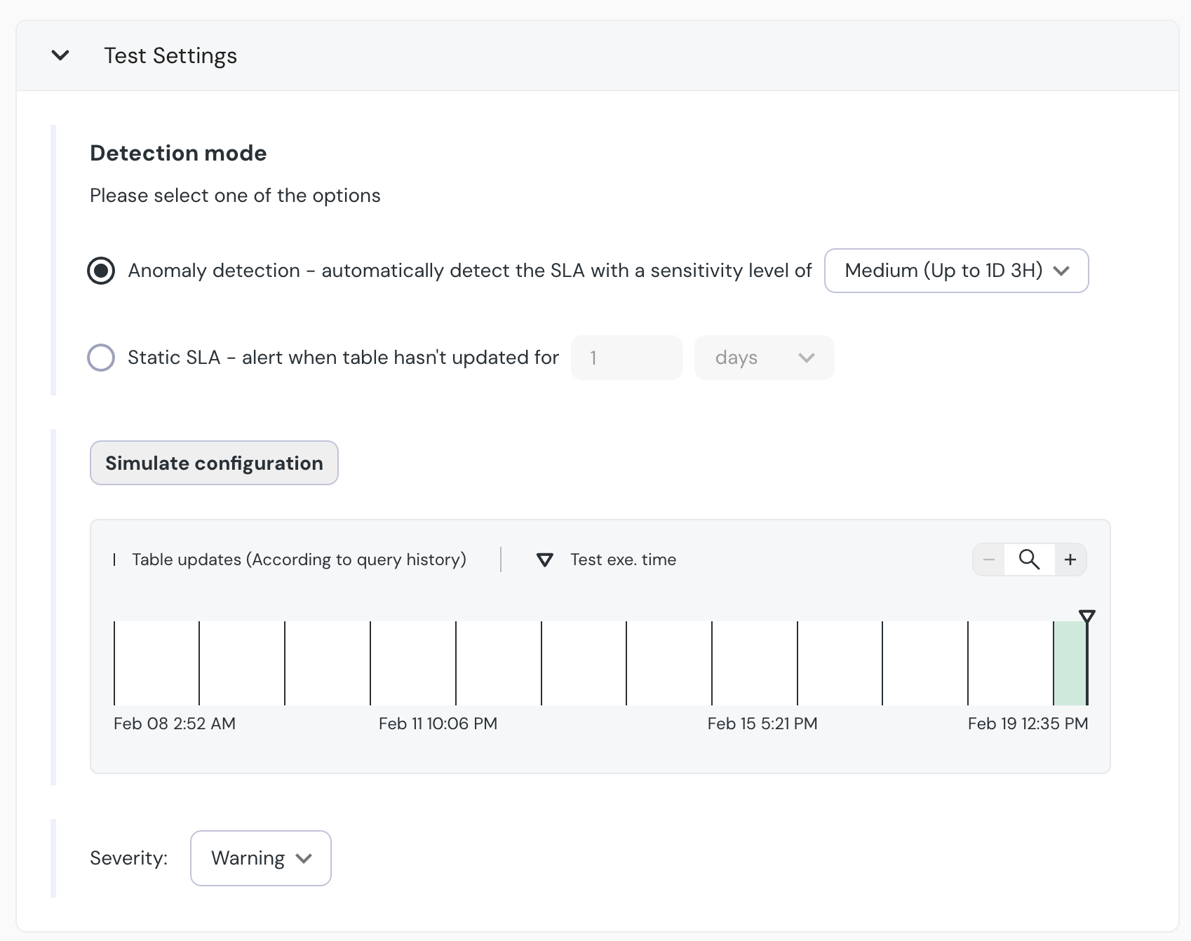 While our automated freshness test uses anomaly detection to identify unusual delays in table updates, sometimes you need more precise control. With manual thresholds, you can explicitly define when a freshness test should fail, giving you full control over monitoring your data freshness requirements. Simply set your desired threshold, and you’ll be notified whenever a table hasn’t refreshed within that time limit.