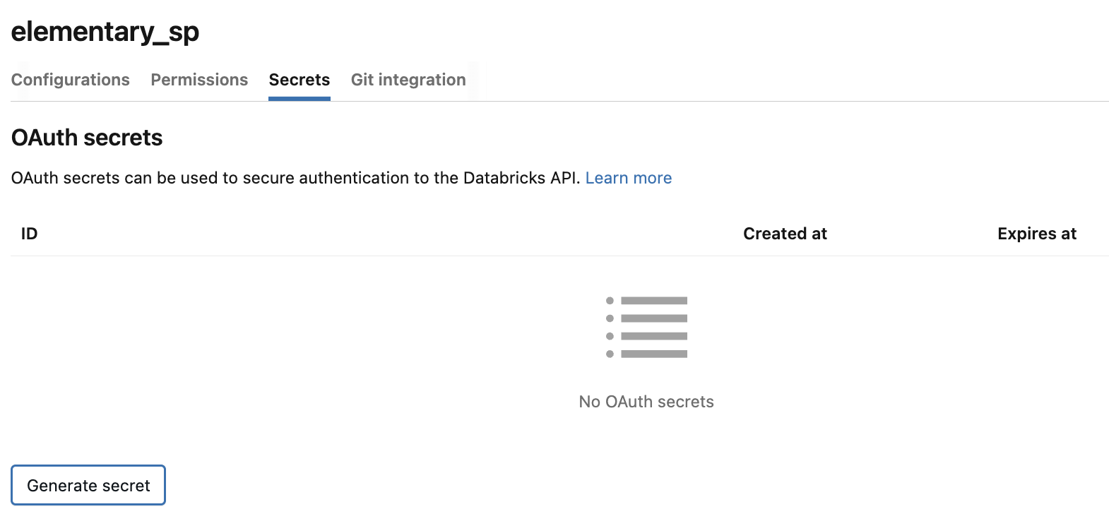 On the service principal page, go to the Secrets tab and click Generate secret. Copy the Client ID (this is the same as the “Application ID” from step 5) and the generated Client secret — you will need both when configuring the Elementary environment.