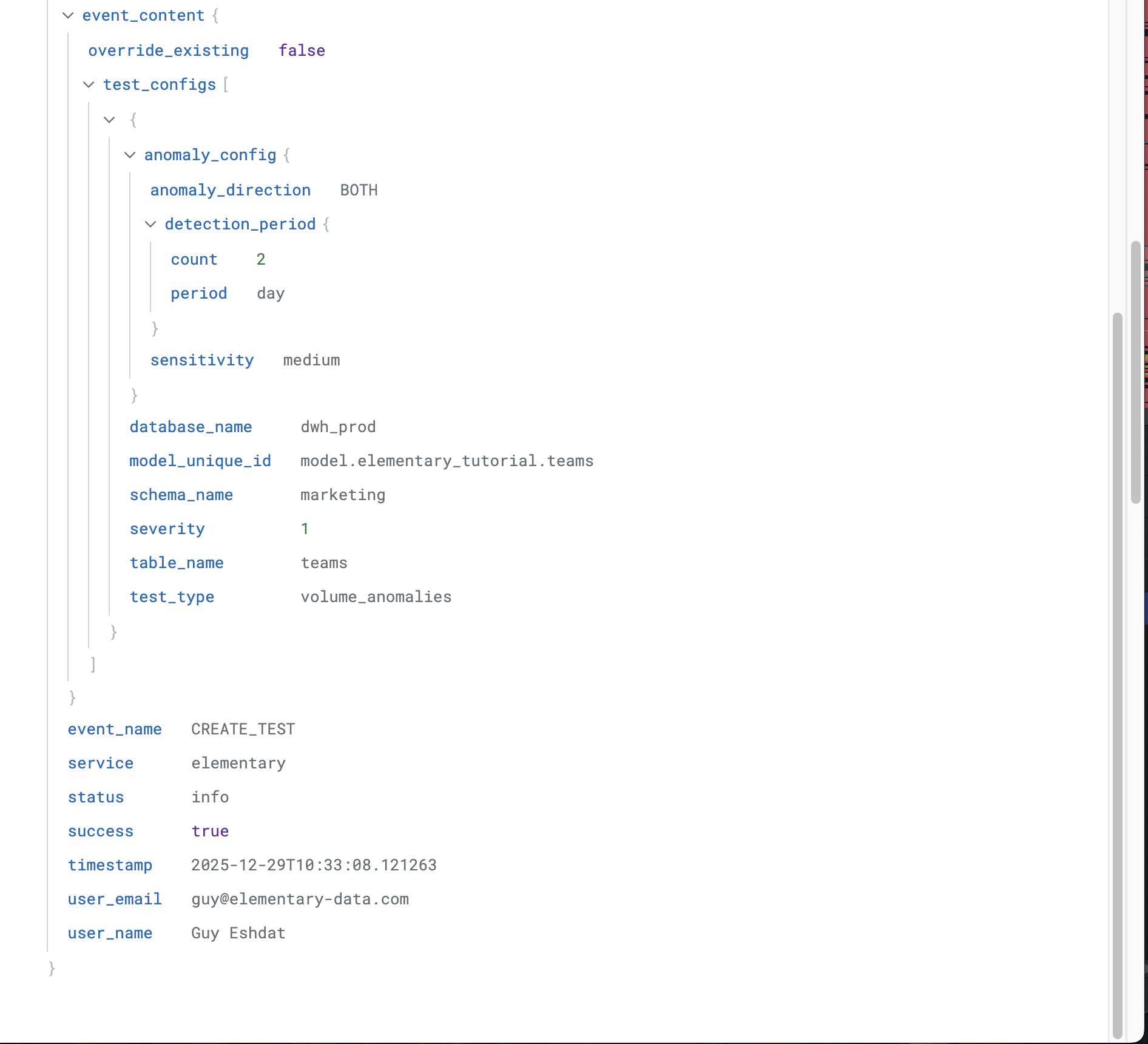 Each user activity log entry includes:timestamp: ISO 8601 timestamp of the eventstatus: Log level (infofor successful actions,errorfor failed actions)message: Human-readable description of the actionservice: Service name (configurable, defaults toelementary)source: Source tag (configurable, defaults toelementary-cloud)dd.tags: Additional tags including:log_type:auditaction:<action_name>(e.g.,user_login,create_test)success:<true|false>user_email:<user_email>env_id:<environment_id>(if applicable)env_name:<environment_name>(if applicable)