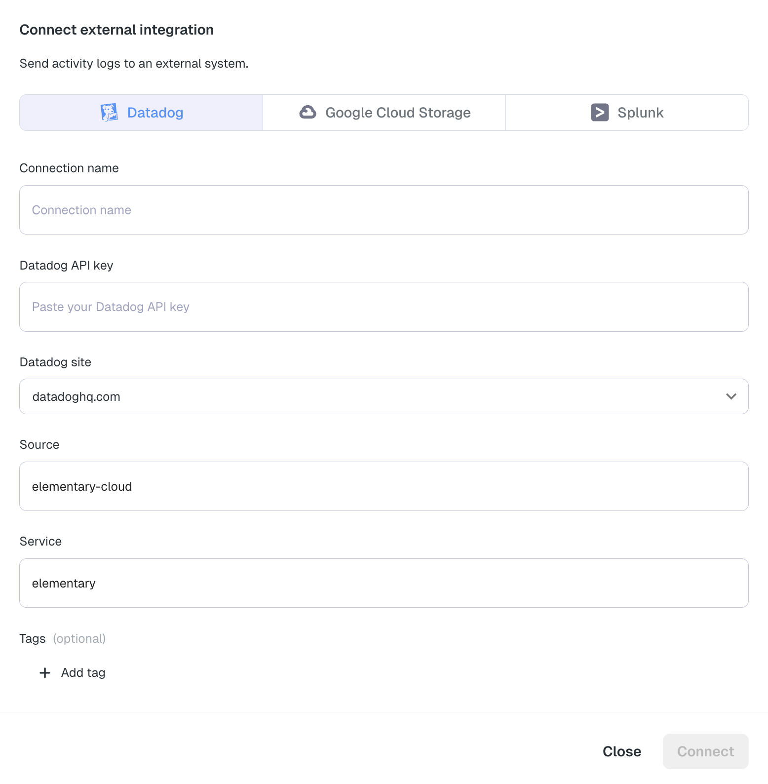 elementary) - Source (optional): Custom source tag for logs (defaults to
