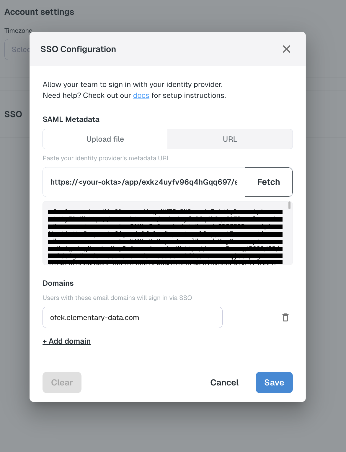 - SAML Metadata: Choose “URL”, paste the link you copied from Okta into the URL field, and click “Fetch”.
